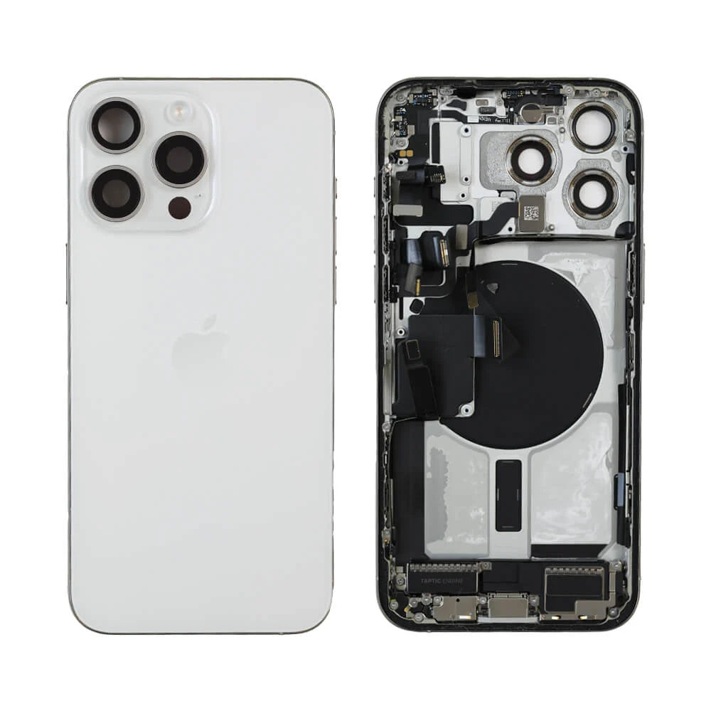 What's Included- 1 x Genuine iPhone 15 Pro Max - Mid Frame/Back Glass With Parts - White - Reclaimed